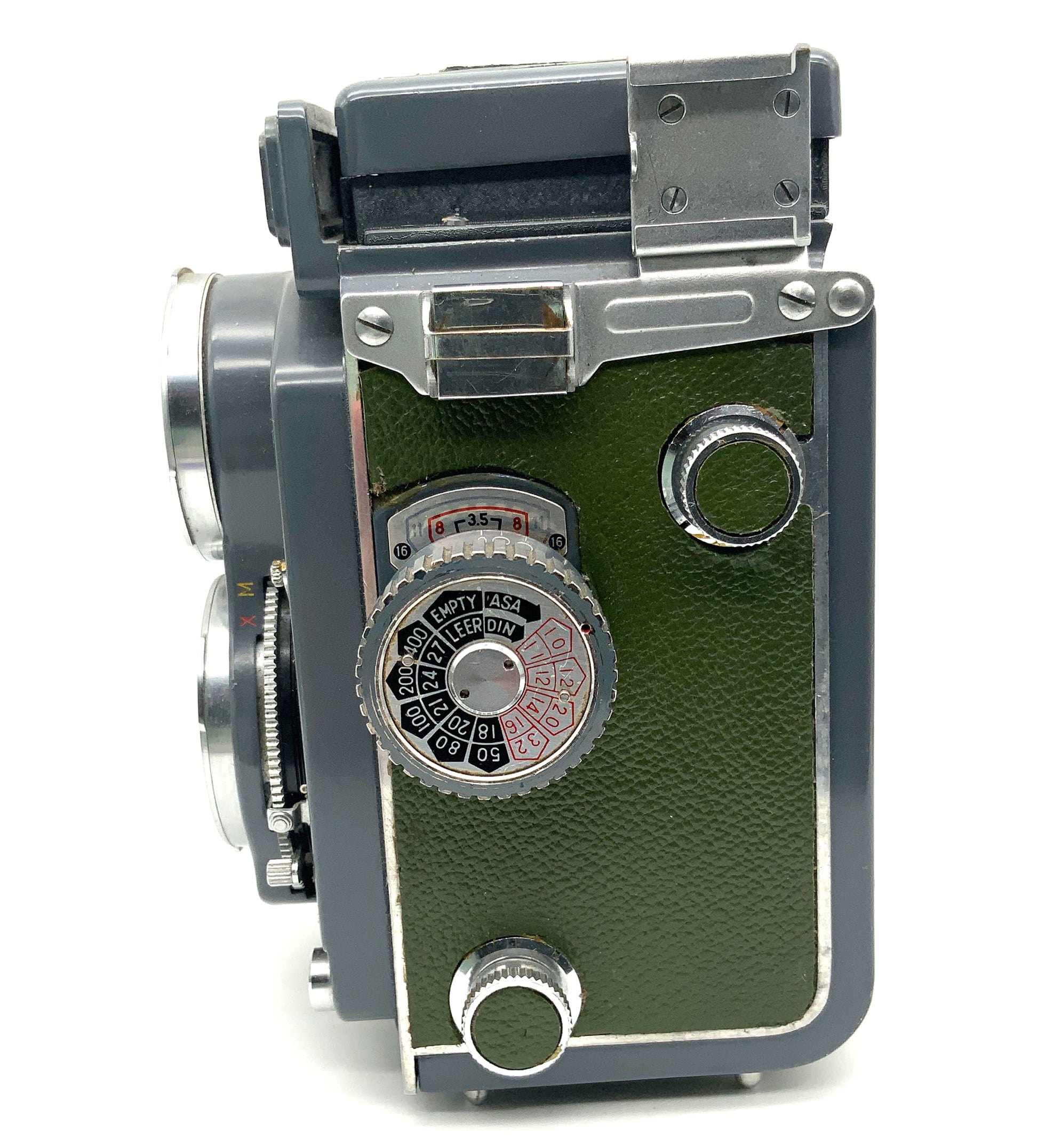 Diese klassische TLR-Kamera (zweiäugig) vereint analoge Technik mit ikonischem Design. Sie wurde sorgfältig geprüft und ist voll funktionsfähig: Der Verschluss löst sauber aus, der Filmtransport funktioniert zuverlässig und der Lichtschachtsucher liefert ein klares Bild.
