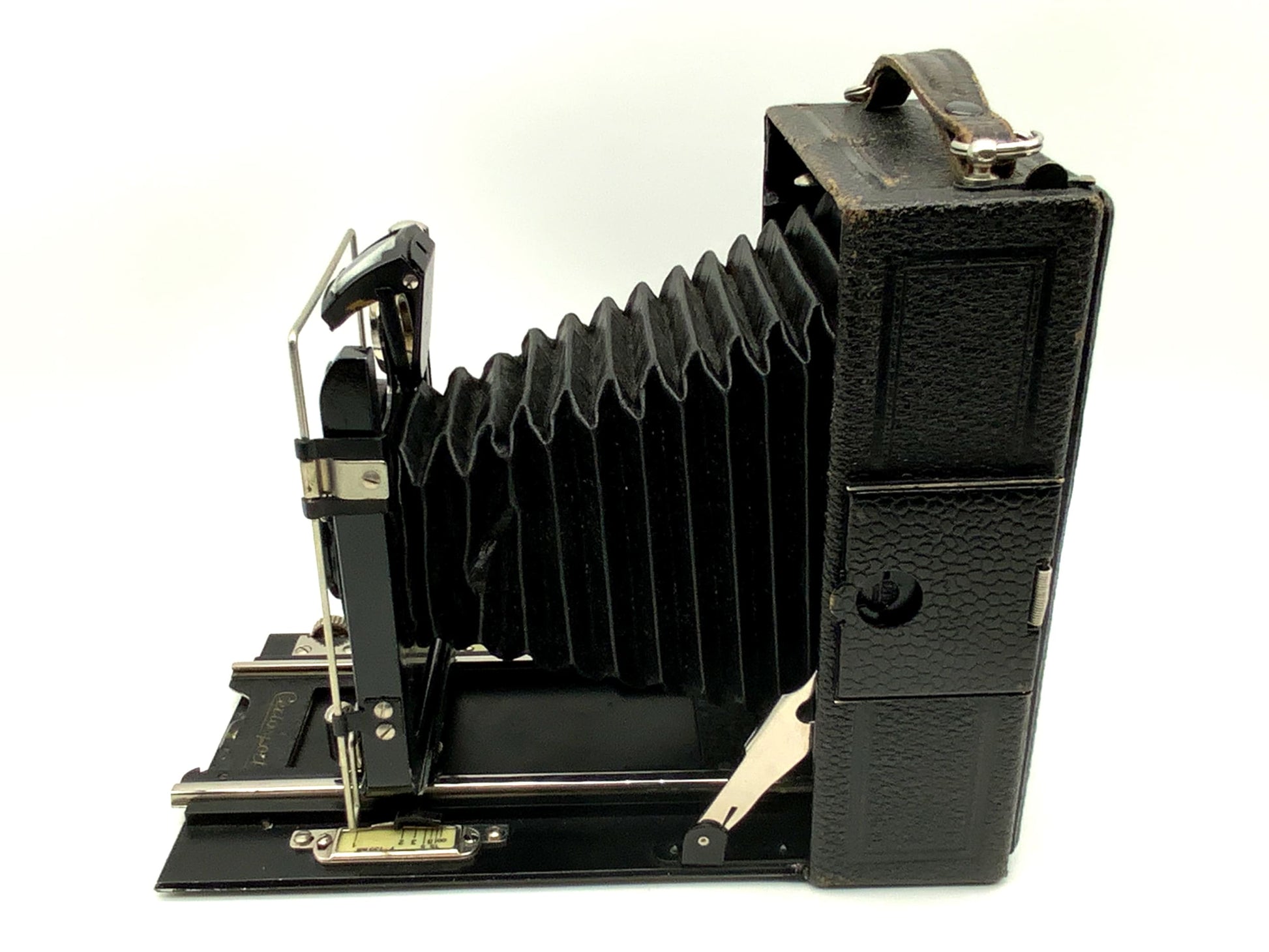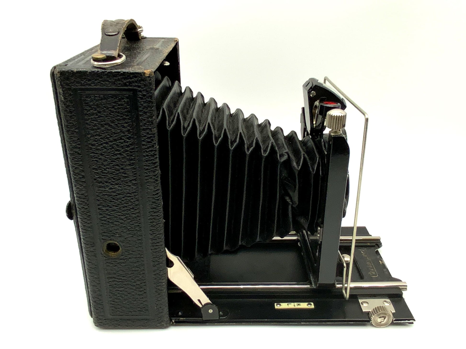 Das Gehäuse zeigt nur leichte Gebrauchsspuren wie feine Kratzer, Patina oder dezente Abnutzung – genau das, was man bei einem gut erhaltenen historischen Modell erwarten darf. Ob für Großformat-Liebhaber, Sammler oder als stilvolles Objekt – diese Kamera überzeugt durch Technik und Präsenz.