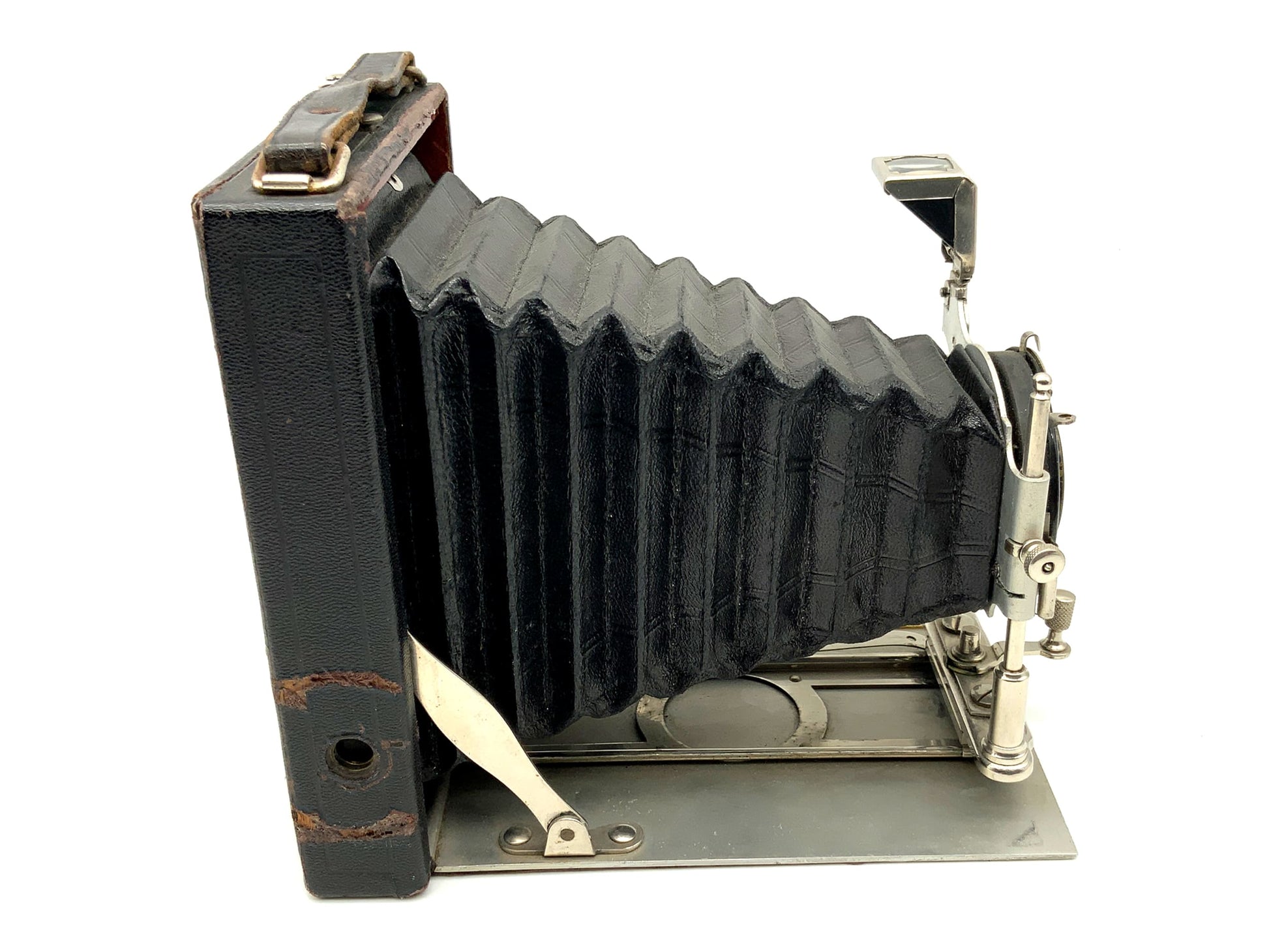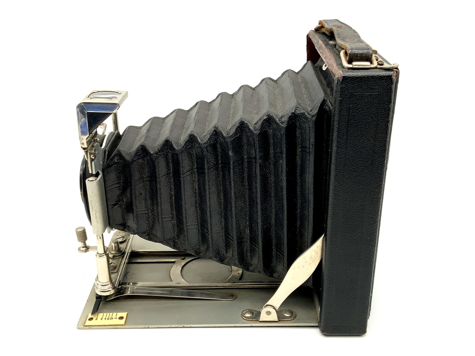 Das Gehäuse zeigt nur leichte Gebrauchsspuren wie feine Kratzer, Patina oder dezente Abnutzung – genau das, was man bei einem gut erhaltenen historischen Modell erwarten darf. Ob für Großformat-Liebhaber, Sammler oder als stilvolles Objekt – diese Kamera überzeugt durch Technik und Präsenz.