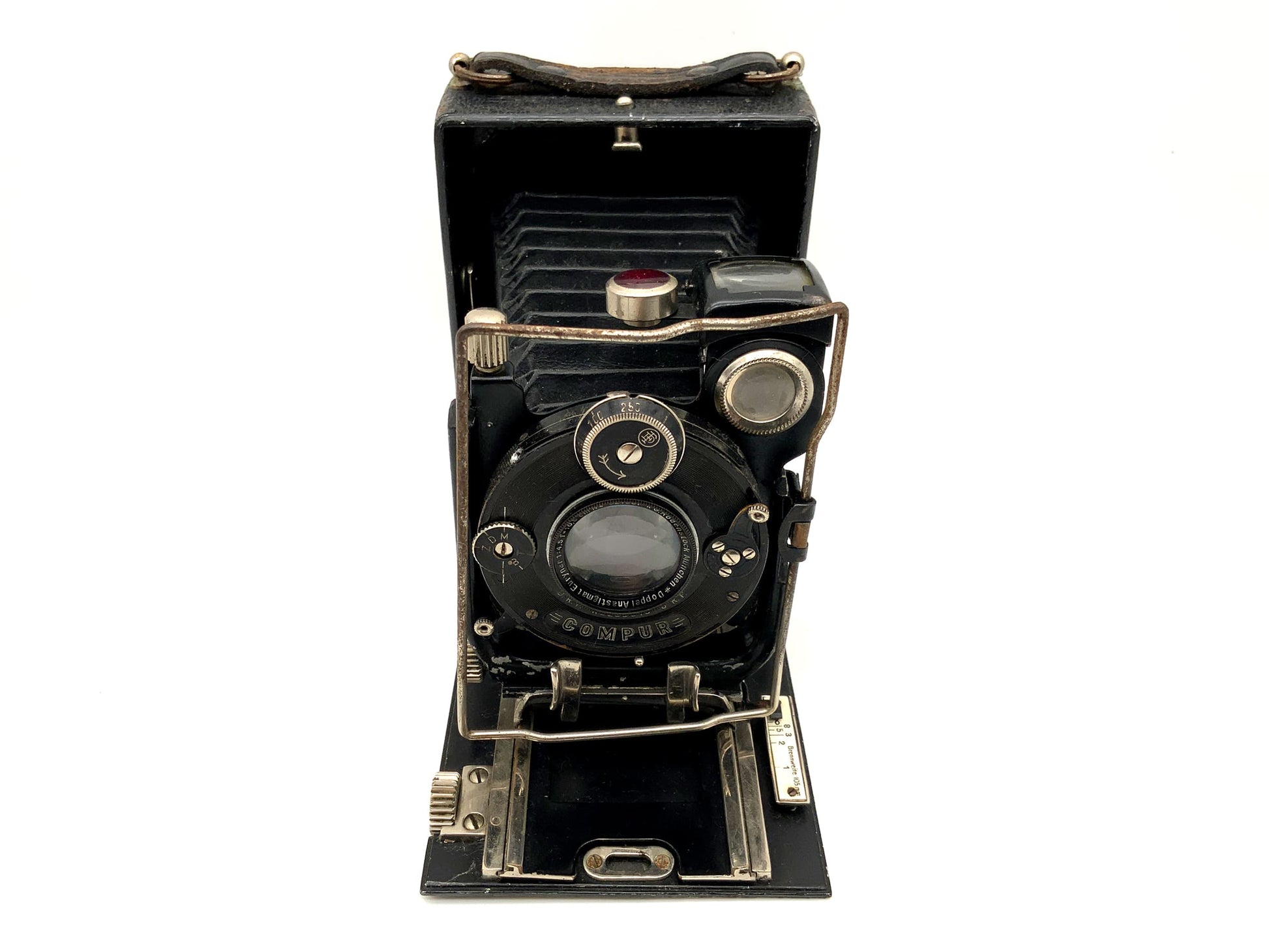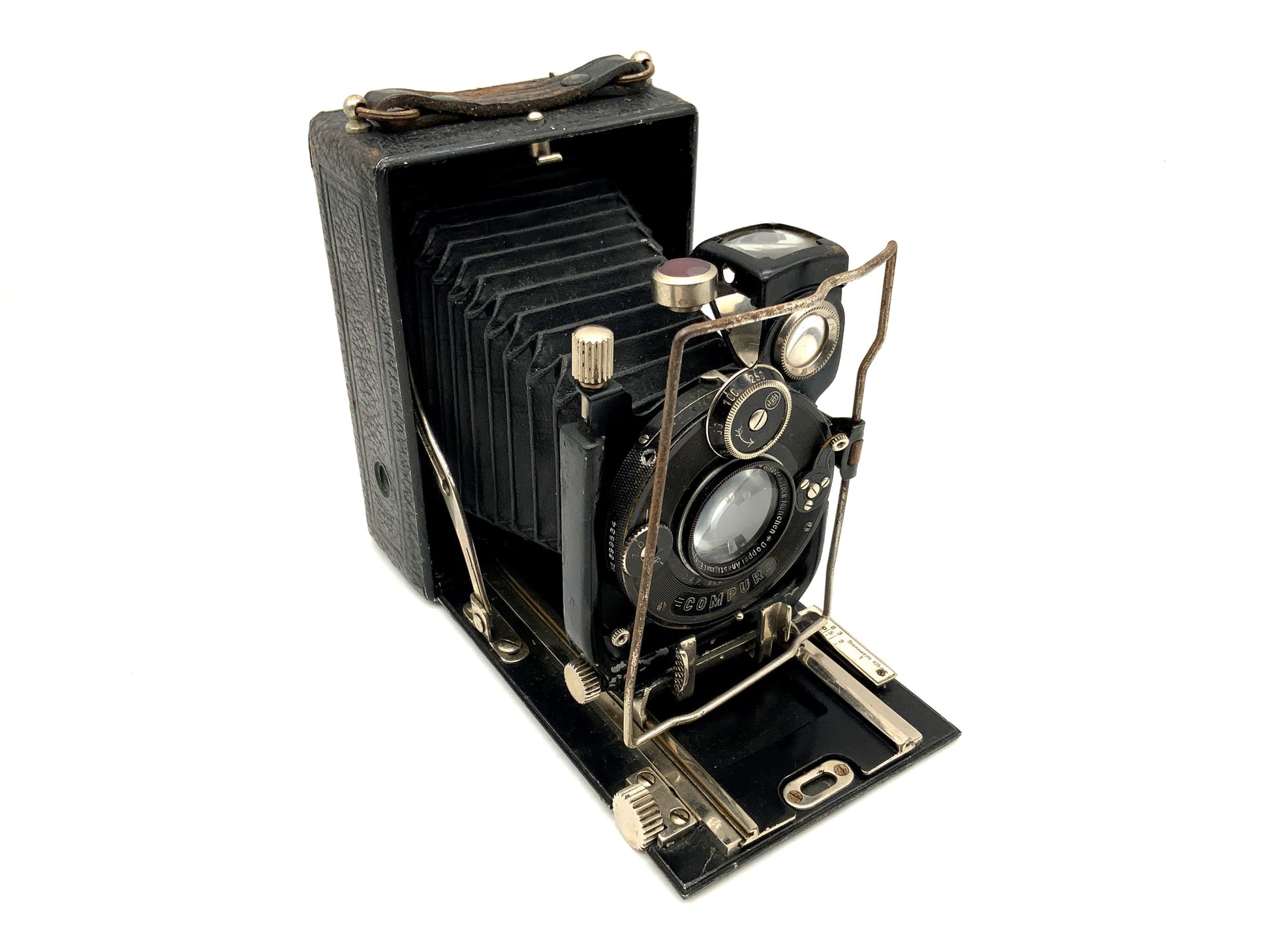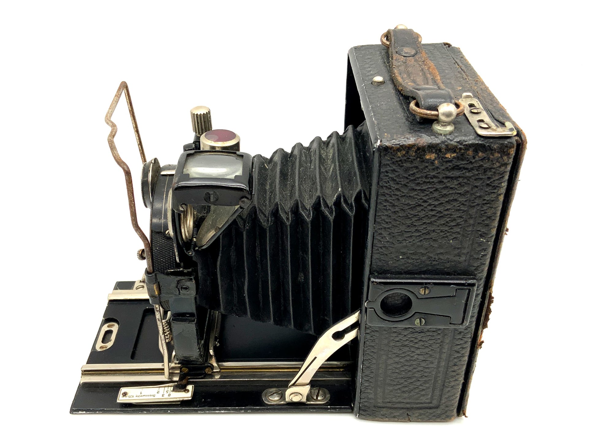 Das Gehäuse zeigt nur leichte Gebrauchsspuren wie feine Kratzer, Patina oder dezente Abnutzung – genau das, was man bei einem gut erhaltenen historischen Modell erwarten darf. Ob für Großformat-Liebhaber, Sammler oder als stilvolles Objekt – diese Kamera überzeugt durch Technik und Präsenz.