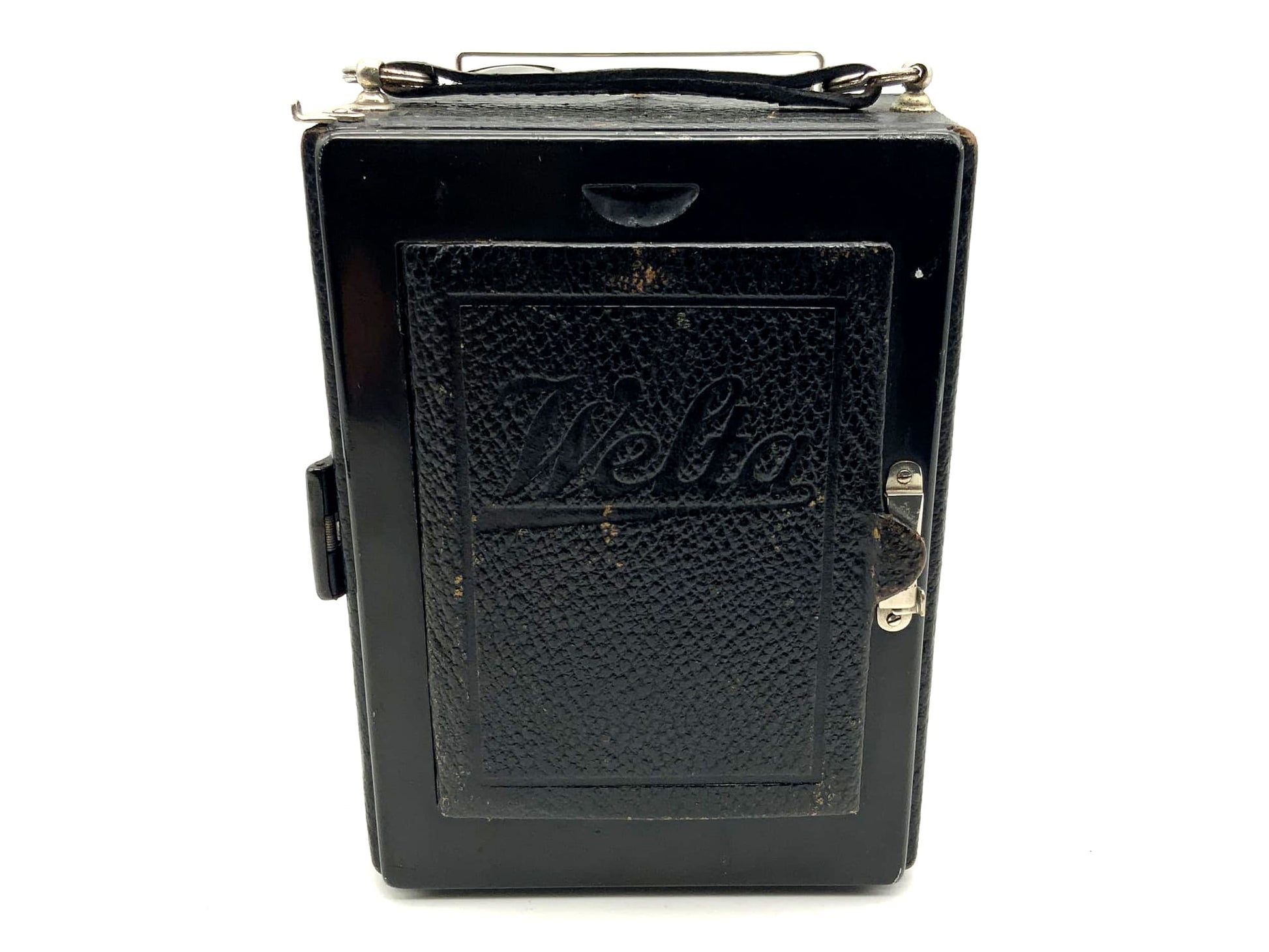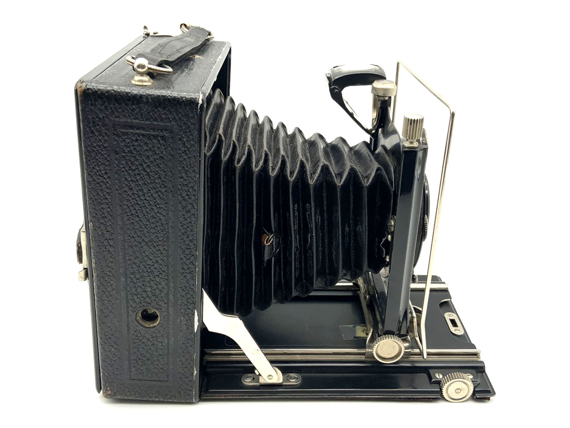 Das Gehäuse zeigt nur leichte Gebrauchsspuren wie feine Kratzer, Patina oder dezente Abnutzung – genau das, was man bei einem gut erhaltenen historischen Modell erwarten darf. Ob für Großformat-Liebhaber, Sammler oder als stilvolles Objekt – diese Kamera überzeugt durch Technik und Präsenz.