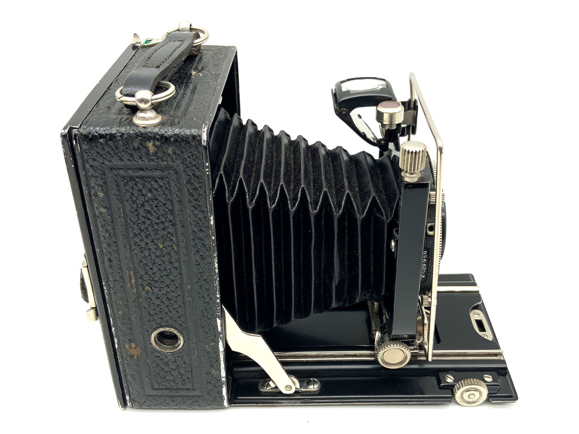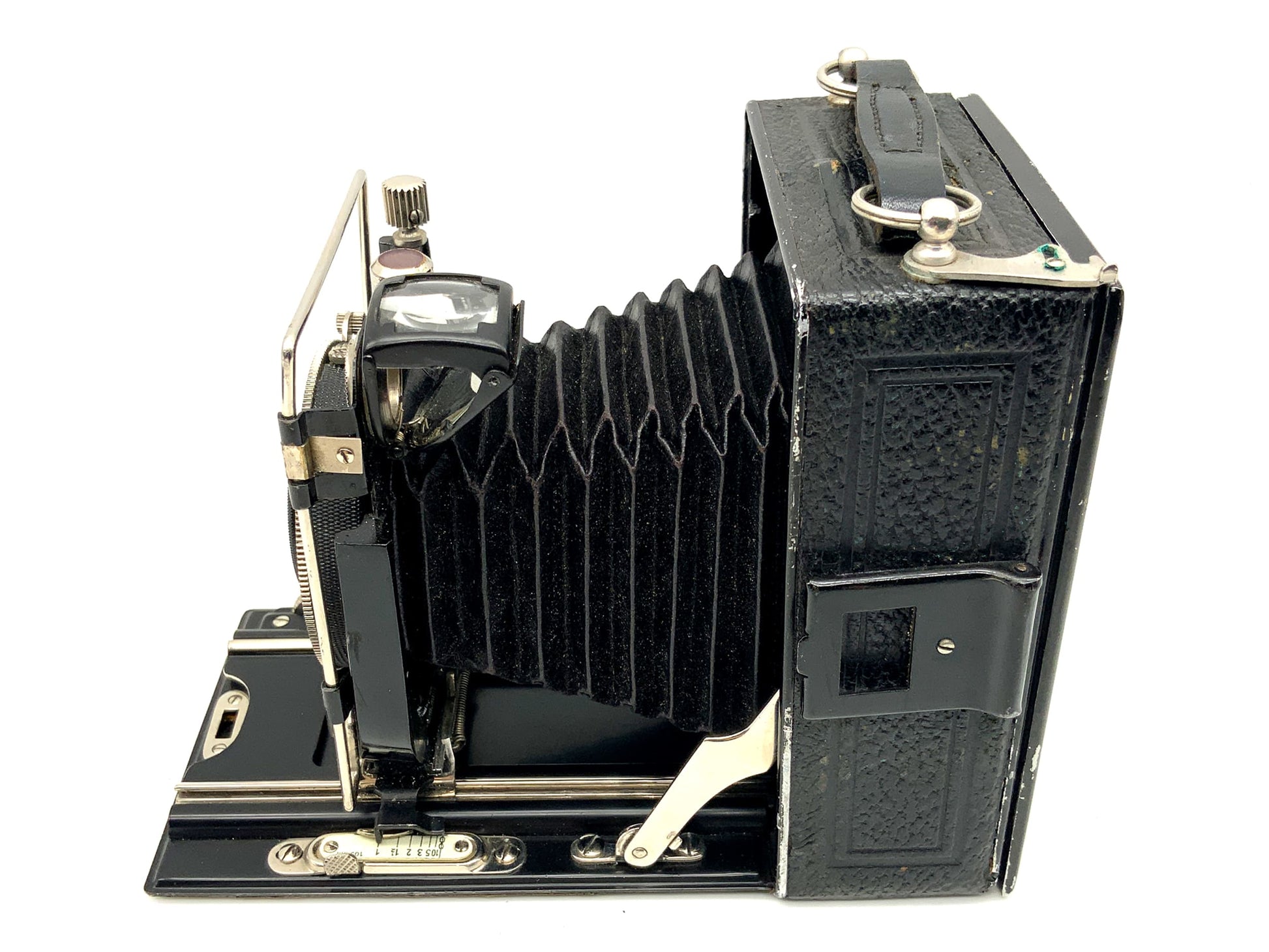 Das Gehäuse zeigt nur leichte Gebrauchsspuren wie feine Kratzer, Patina oder dezente Abnutzung – genau das, was man bei einem gut erhaltenen historischen Modell erwarten darf. Ob für Großformat-Liebhaber, Sammler oder als stilvolles Objekt – diese Kamera überzeugt durch Technik und Präsenz.