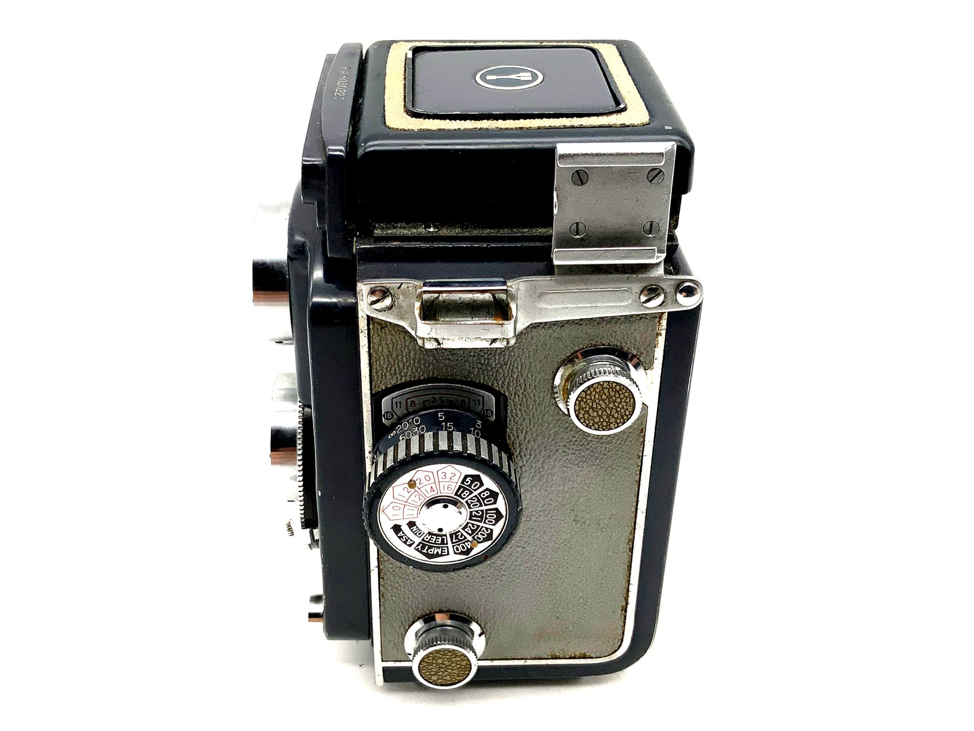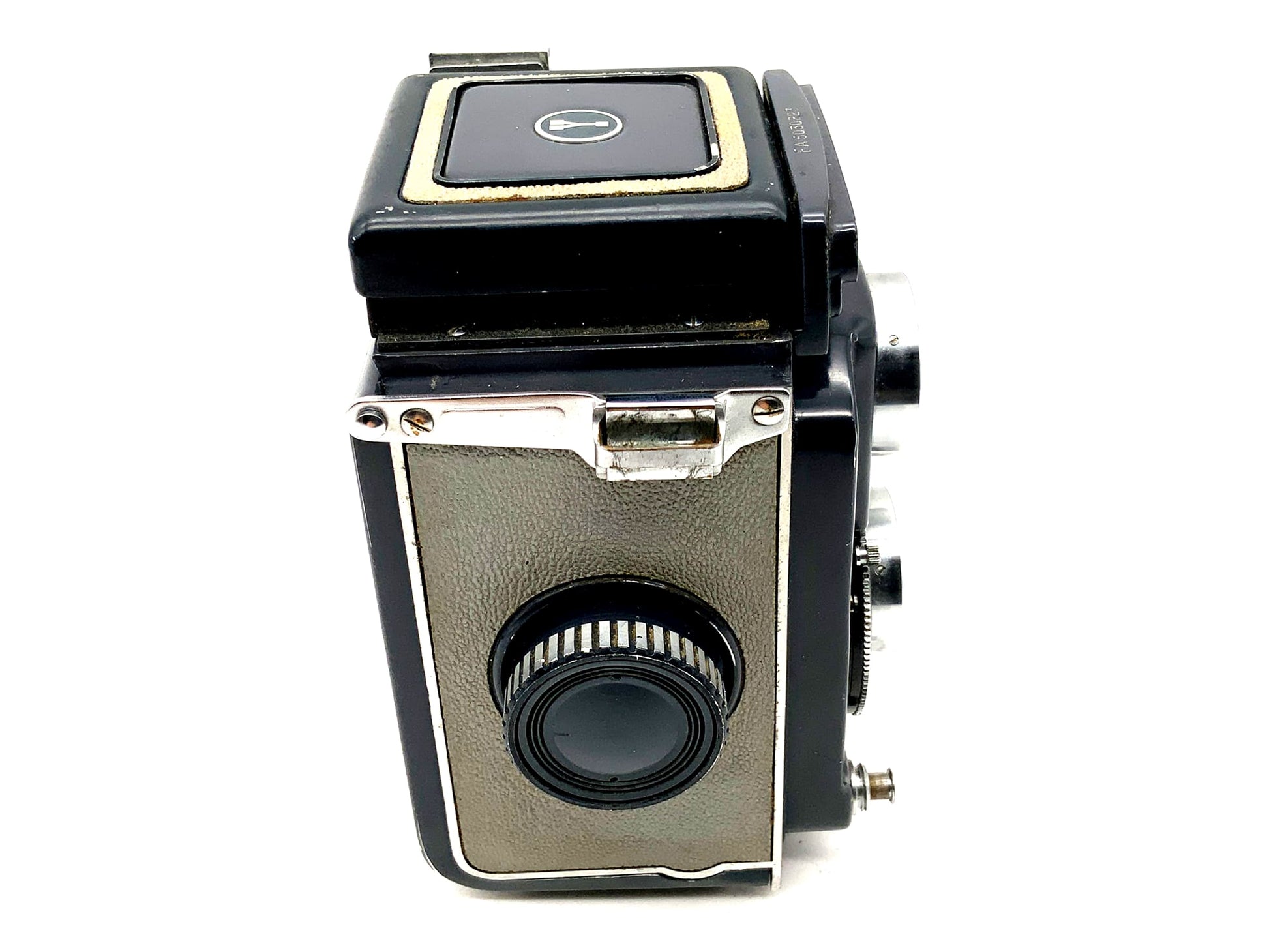 Das Gehäuse zeigt nur leichte Gebrauchsspuren wie feine Kratzer oder dezente Patina – typisch für ein gut erhaltenes Vintage-Modell. Ideal für alle, die echtes Mittelformat-Feeling suchen – ob im Einsatz oder in der Sammlung.