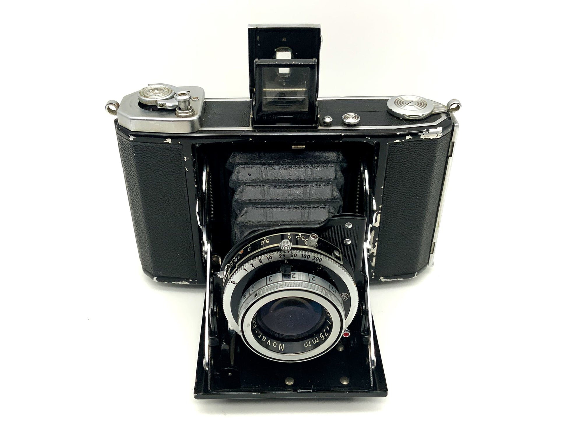 Diese klassische Klappkamera ist technisch geprüft und funktioniert zuverlässig – doch ihre Vergangenheit sieht man ihr an. Der Verschluss arbeitet, der Auslöser reagiert, und der Balgen ist intakt. Allerdings zeigt das Gehäuse deutliche Gebrauchsspuren wie Kratzer, matte Stellen oder kleinere Dellen.